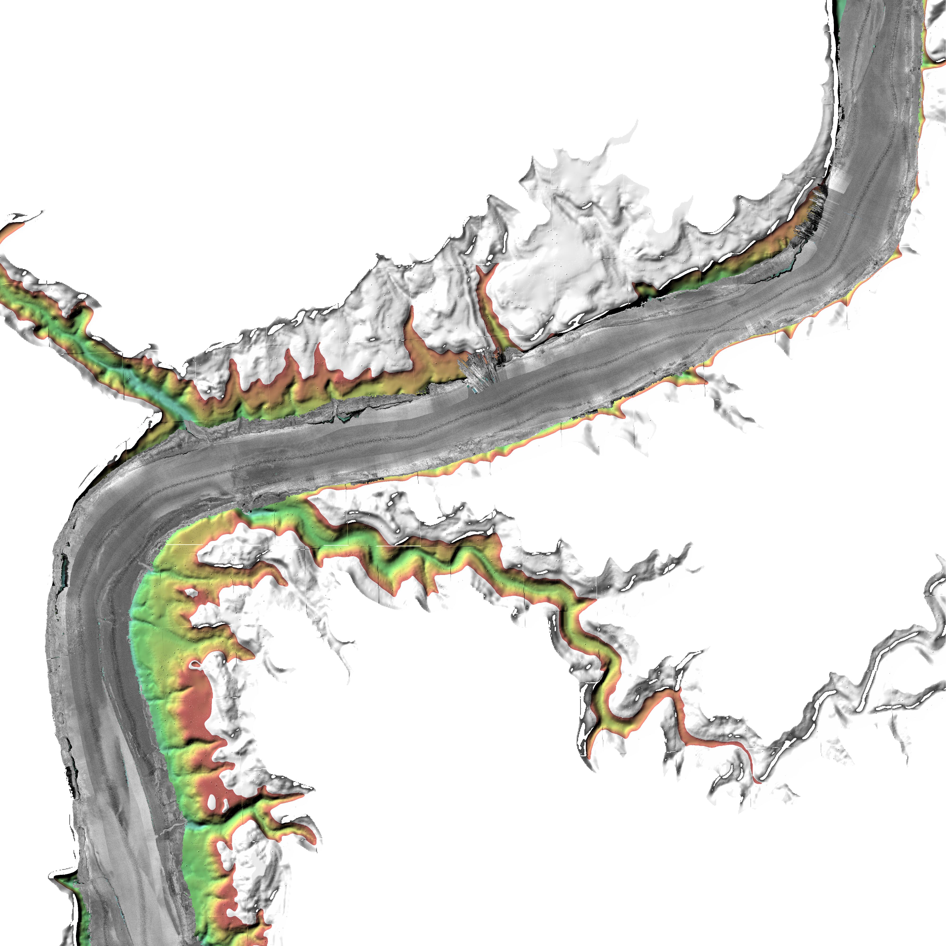 Bathymetry --- Backscatter --- Pre-fill topography |