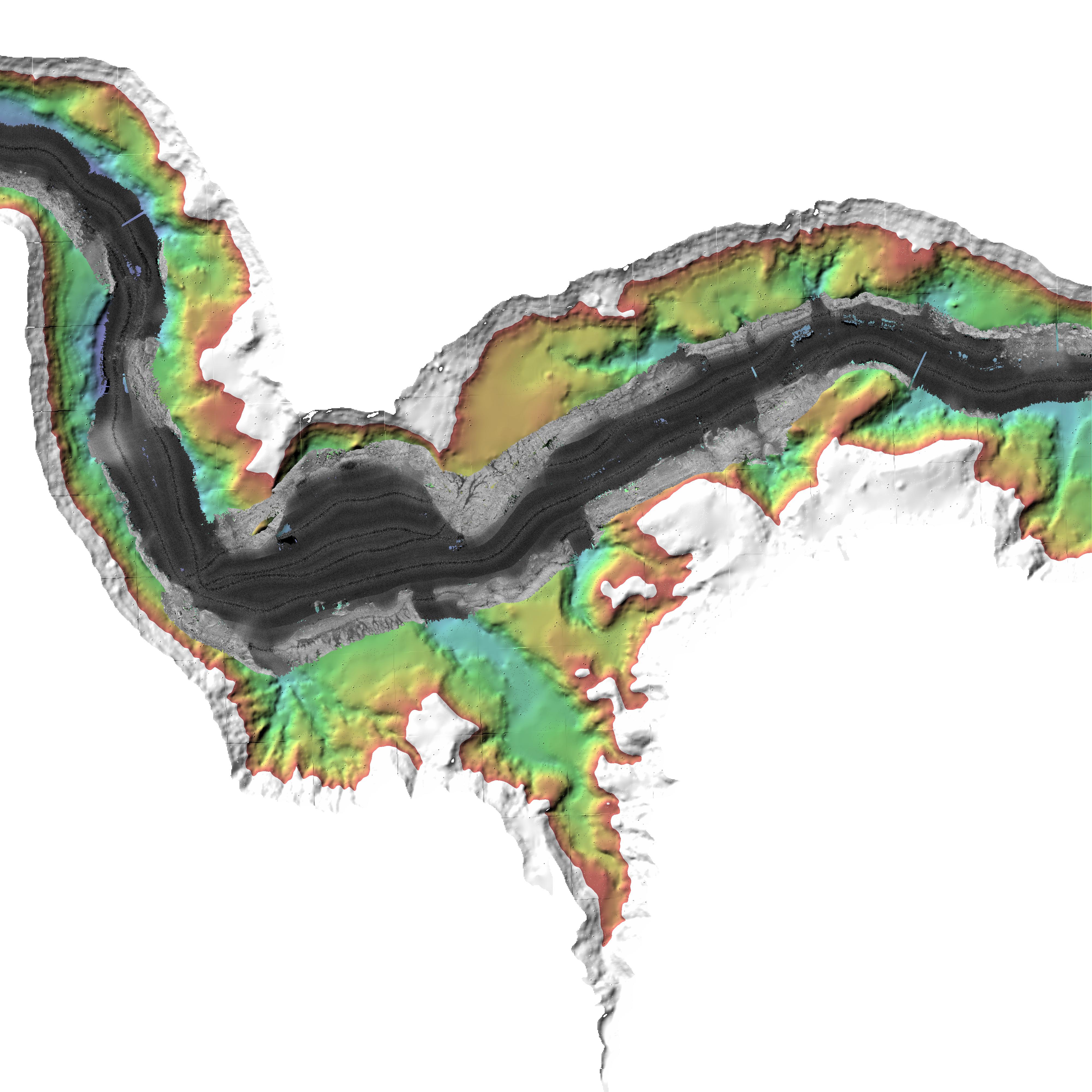 Bathymetry --- Backscatter --- Pre-fill topography |