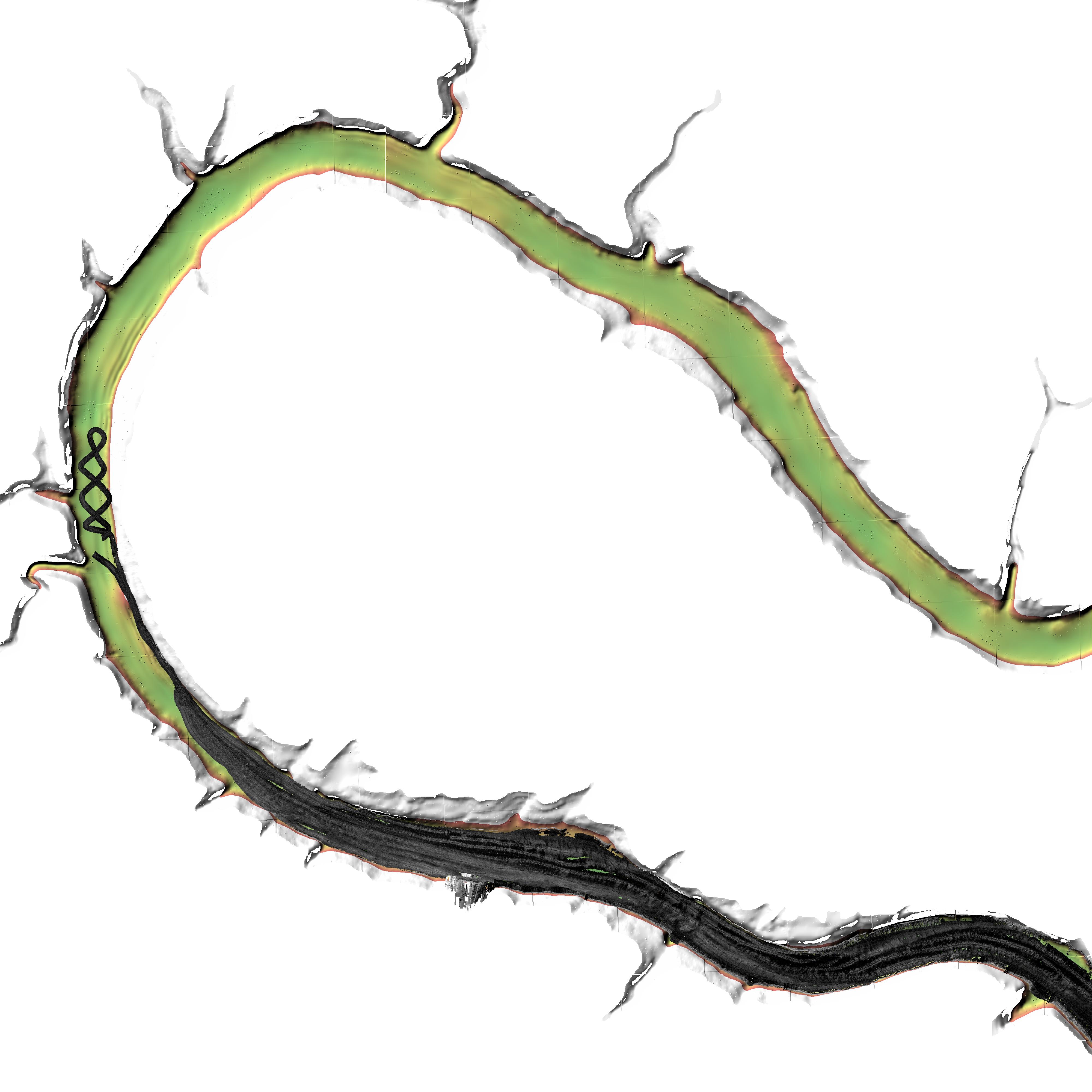Bathymetry --- Backscatter --- Pre-fill topography |