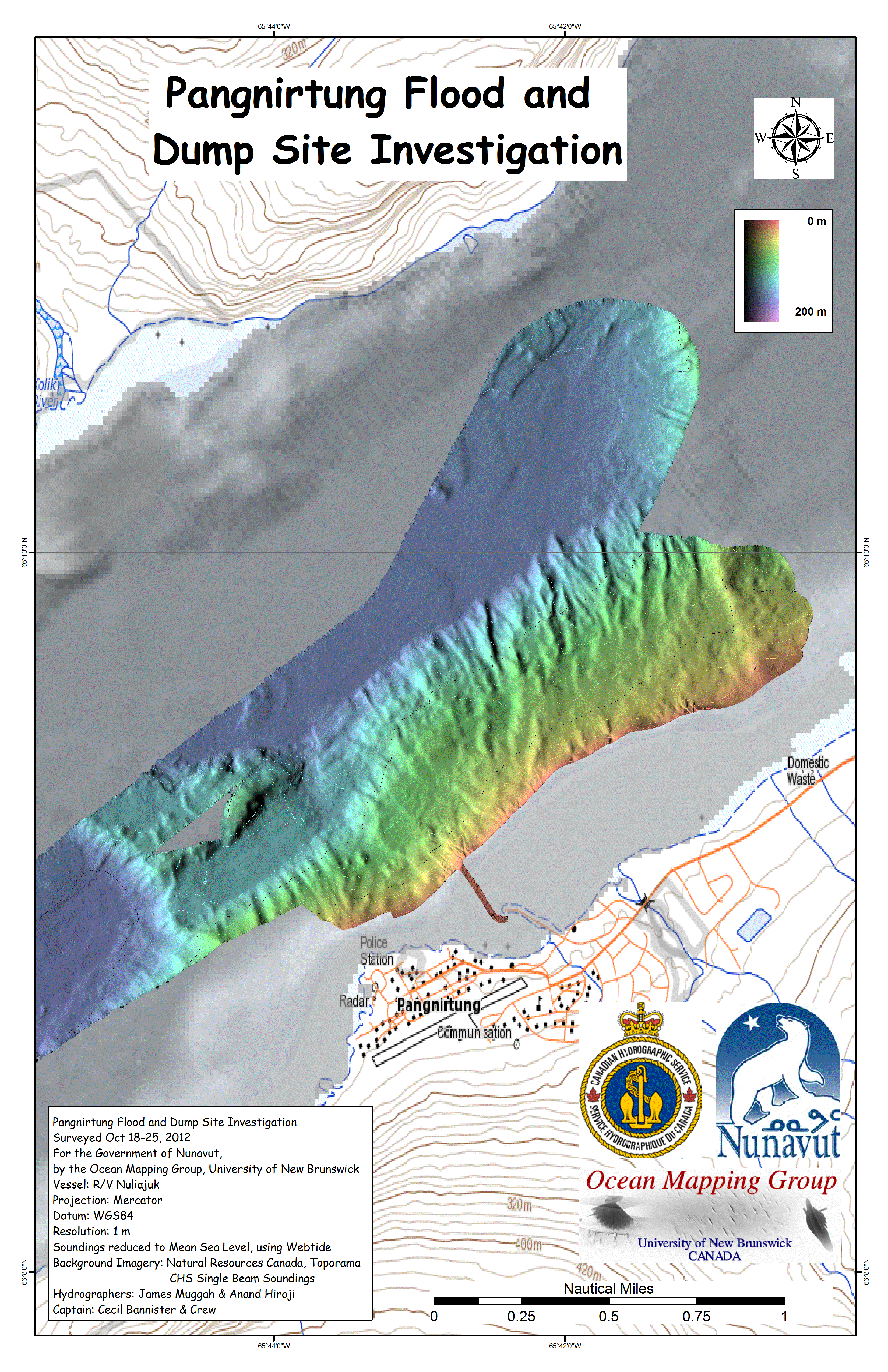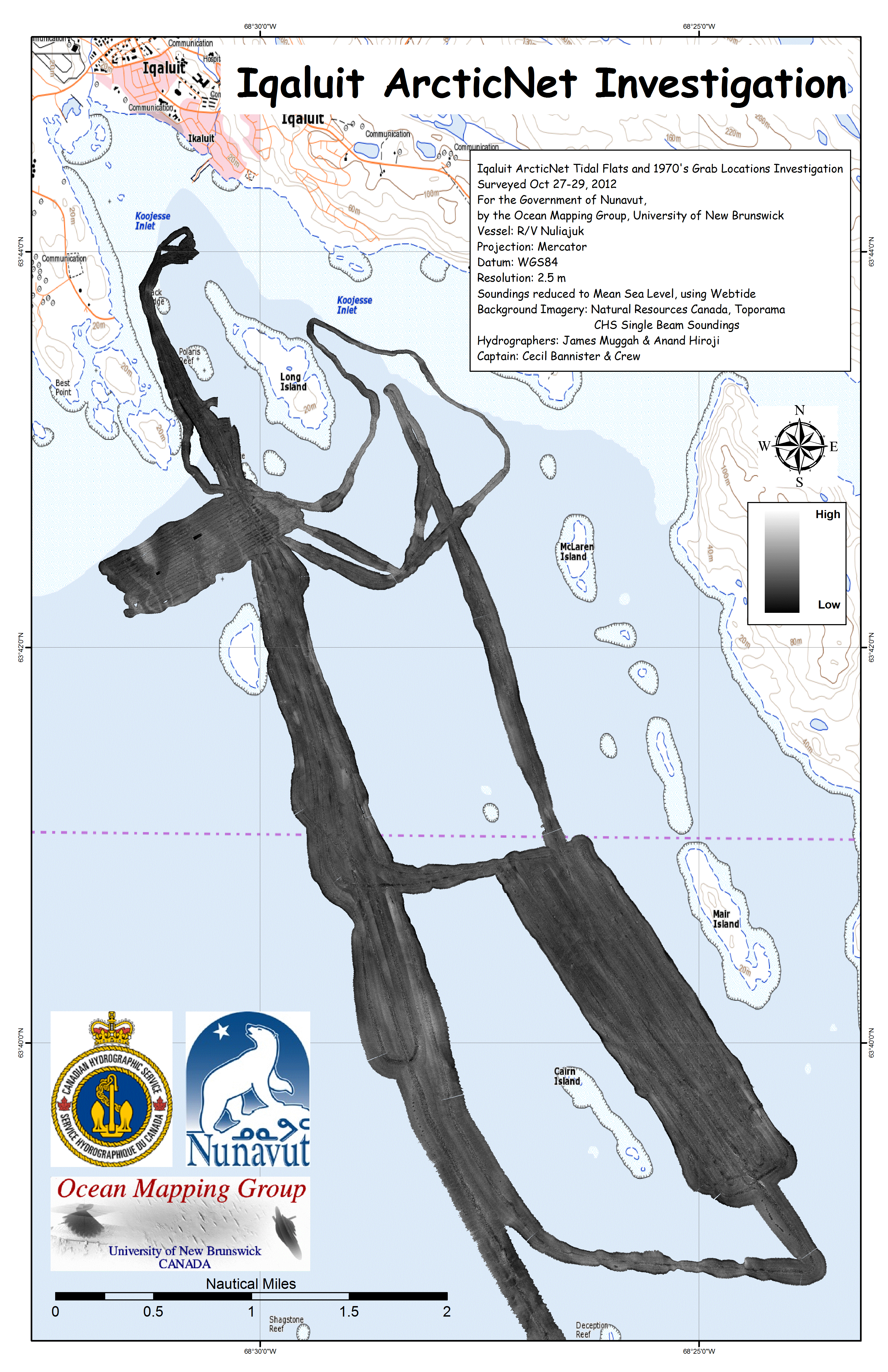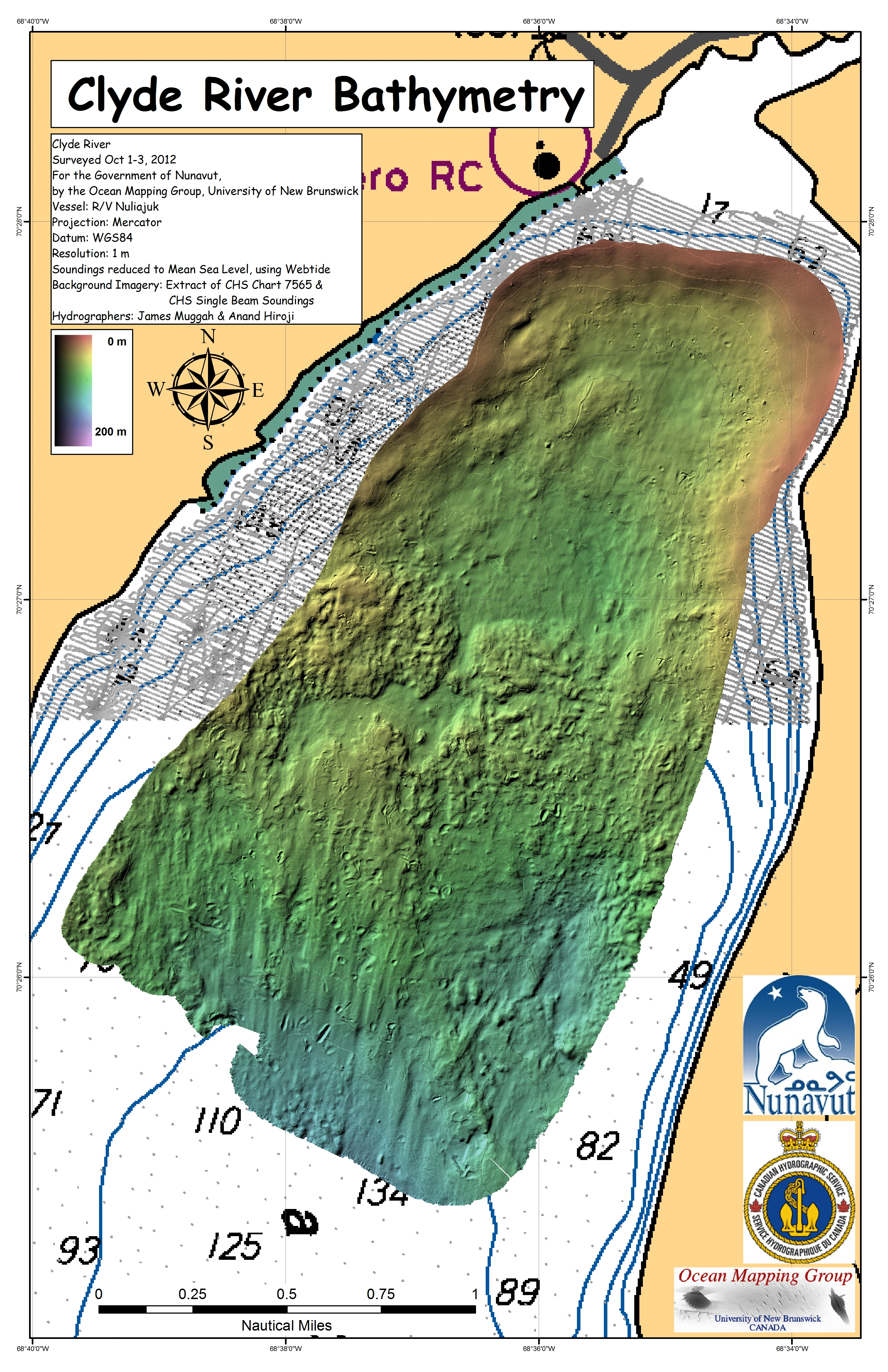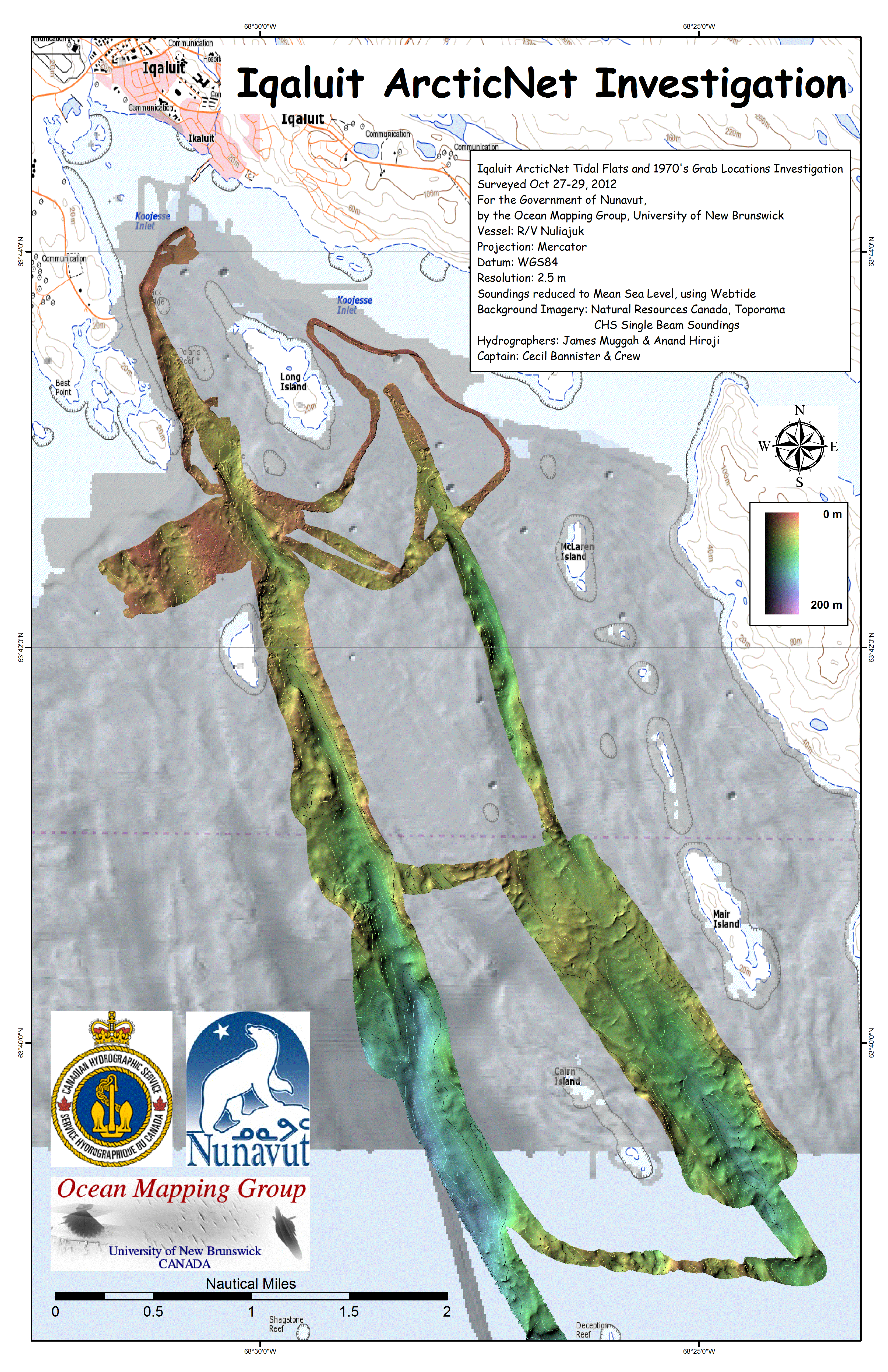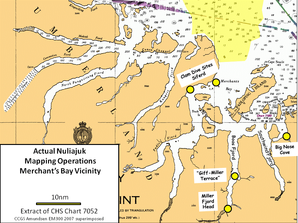 Iqaluit. Apart from a 2 day window in mid August, all the Nuliajuk mapping in Nunavut took place during a 30 day period covering the full month of October. The UNB mapping team boarded in Clyde River and disembarked in Iqaluit. The main target areas were: