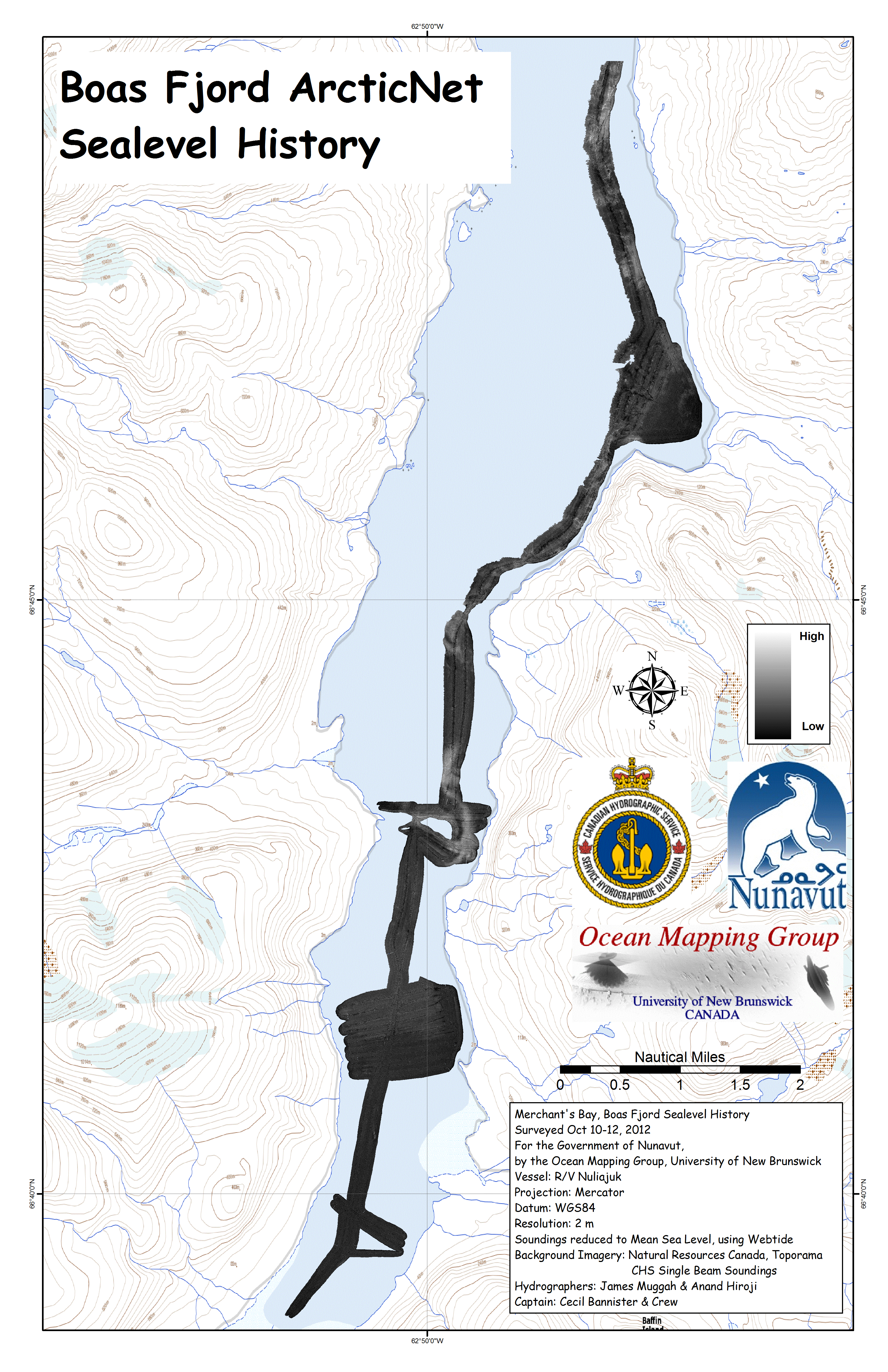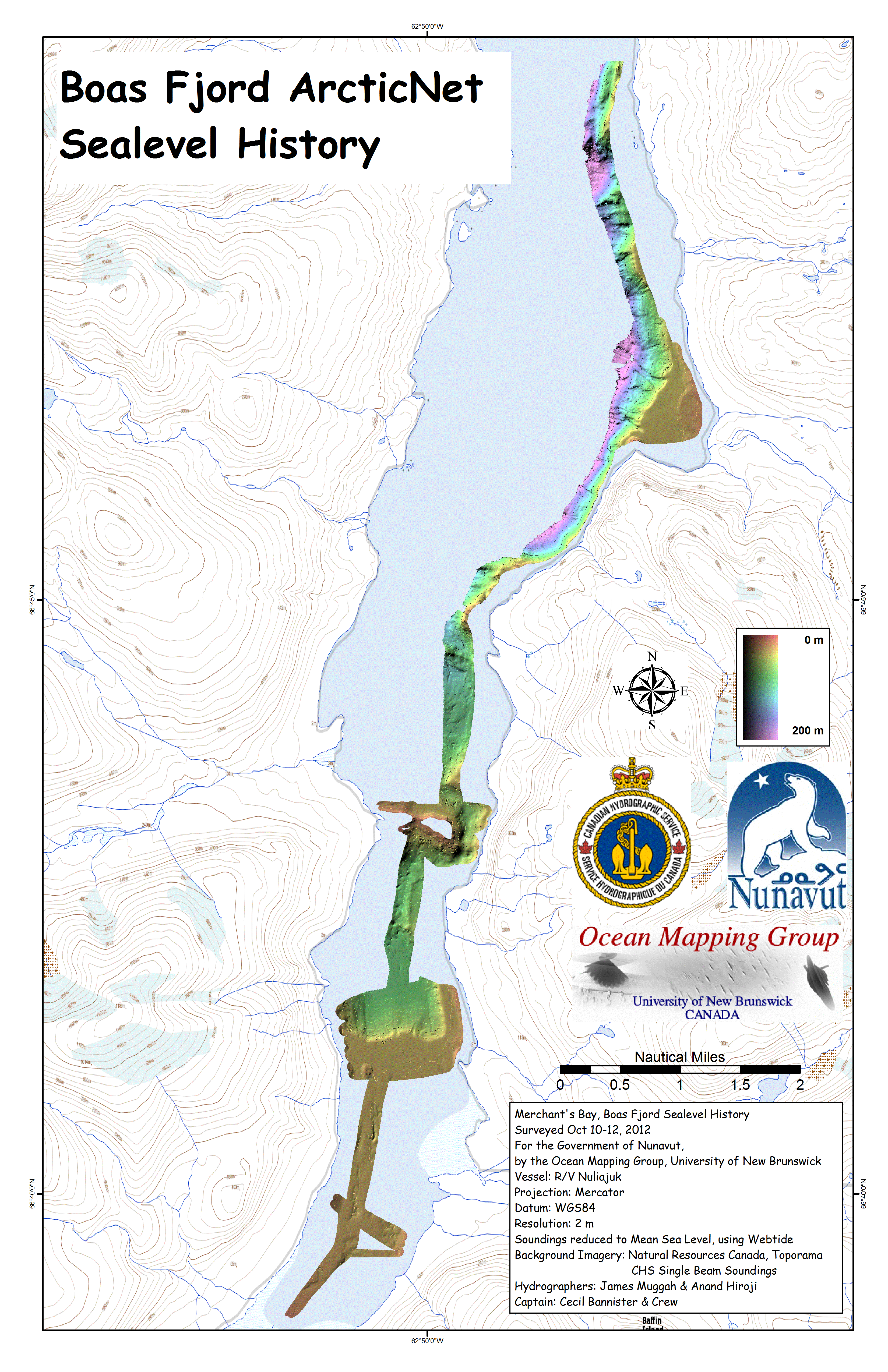 sites The focus site was Boas Fjord where a suspected terrace halfway in and one at the head of the fjord were both investigated. In addition, in order to get to the head of the fjord, a previously unknown sill was identified and partially surveyed (enough to safely get around it). Note that the centre of the fjord is beyond EM3002 tracking depth. The FCV-30 sounder maintains tracking (up to > 1500m) and thus it is hoped that at least a crude representation of the bathymetry > 300m can be preserved. As an anchorage site on the way out, the "Unnamed" cove was investigated and found to also contain a useful submerged terrace. |